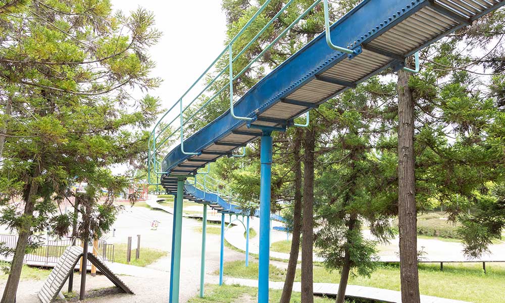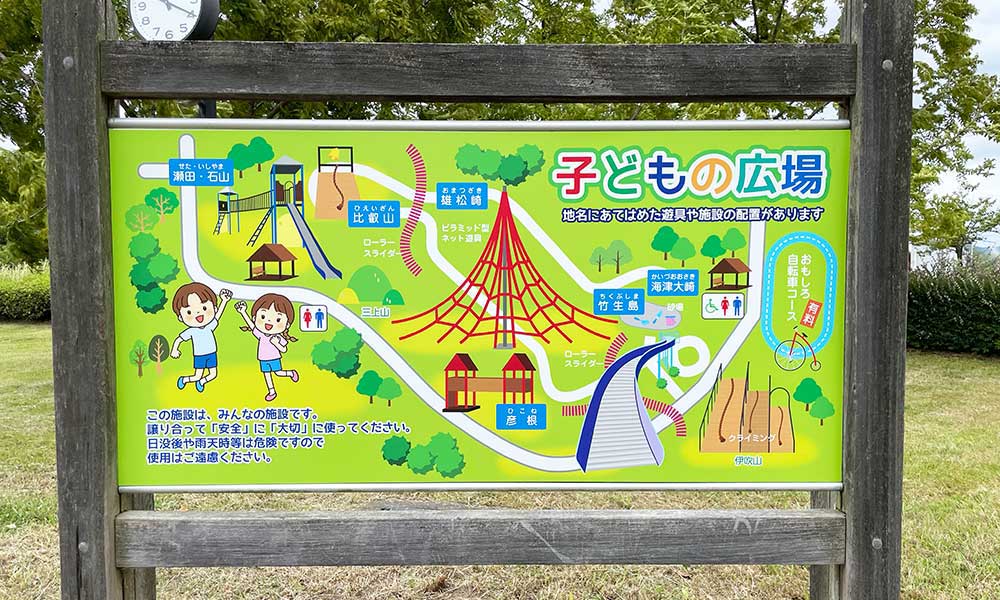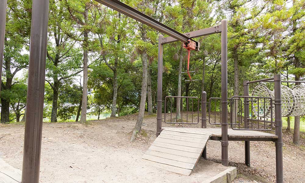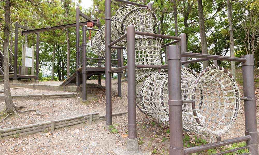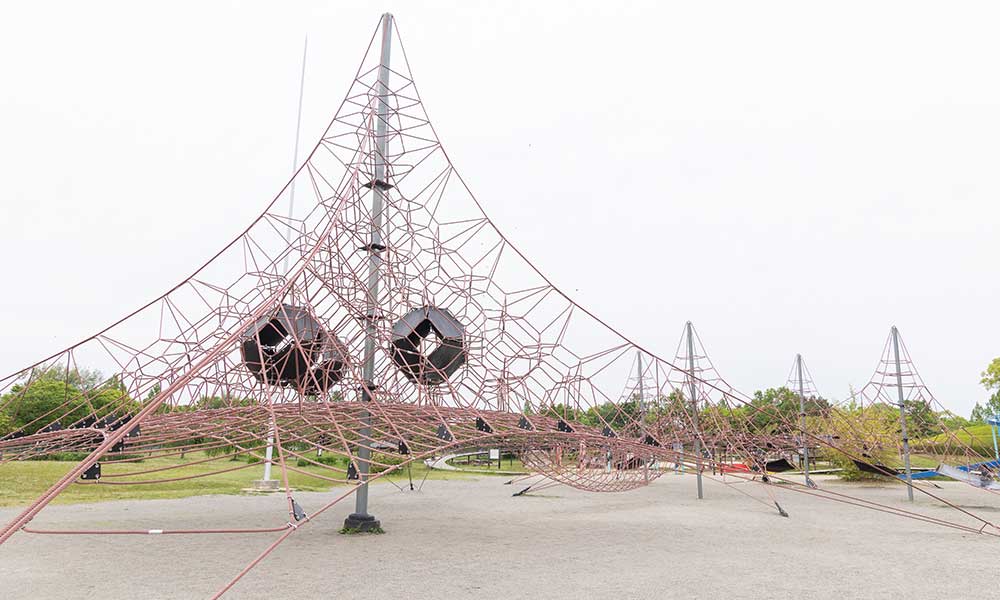 近江八景にちなんだ複合遊具があります。大人気のロープジャングルジムは5つのピラミッド型ジャングルジムが連なったもので、中央のいちばん大きいジャングルジムは、なんと高さ10メートルあります!ぜひチャレンジしてください。
