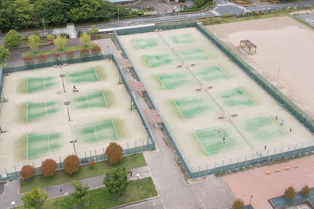 コートは、オムニコート(砂入り人工芝コート)で全部で8面。うち3面はナイター設備もあります。最新の状況は公園管理センターにおたずね下さい。
