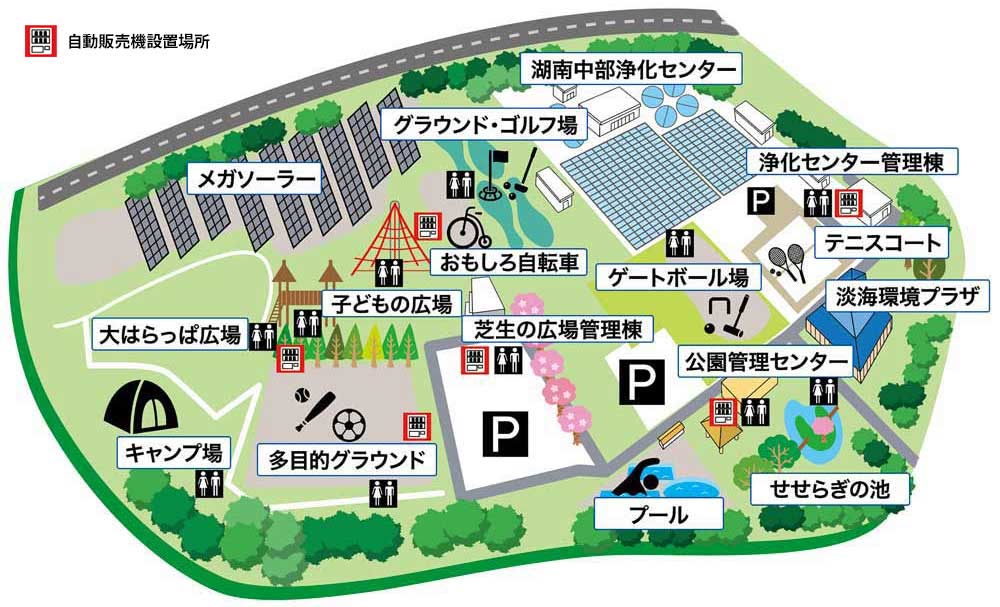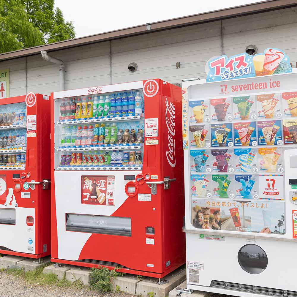 園内には複数の場所に自動販売機を設置しています。小さなお子様のために、飲み物などをご購入いただけます。また、芝生の広場管理棟では、おやつの販売もしています。